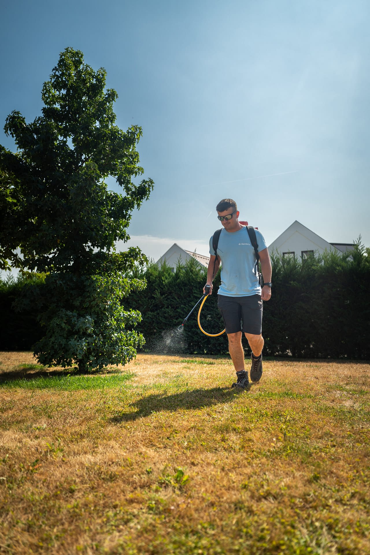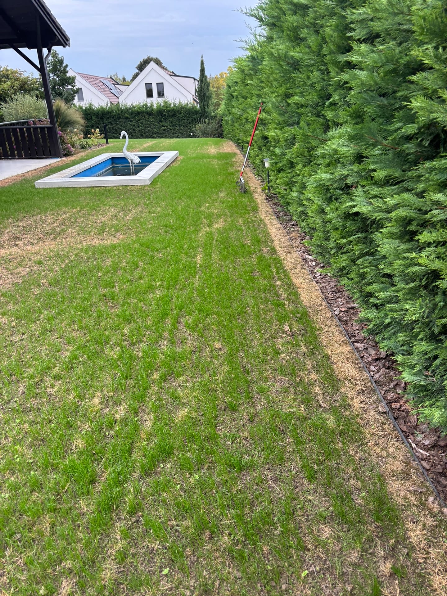Lyuggatásos technikával, minimális bolygatással újrafüvesítettük a területet, és lépésről lépésre egy letisztult, egységes gyepfelületet formáltunk. A munkát mindössze két nap alatt elvégeztük, miután előzetesen gyomirtással megtisztítottuk a talajt, hogy valóban tiszta alapokra építhessünk.