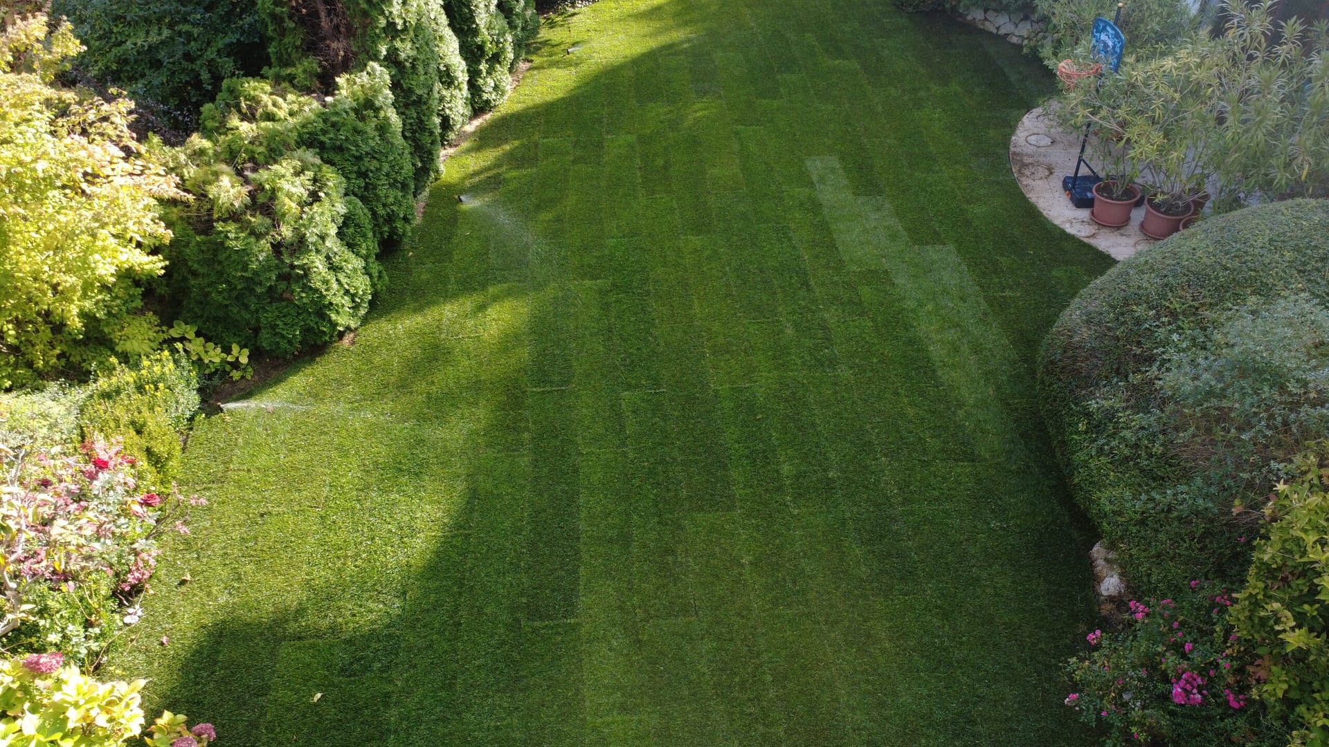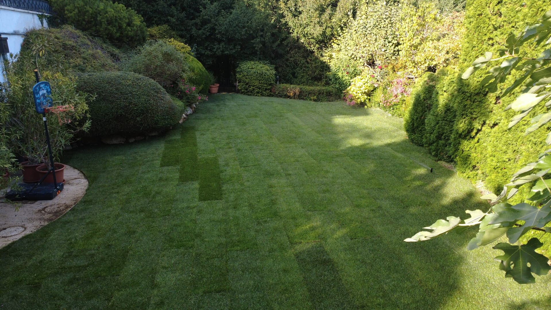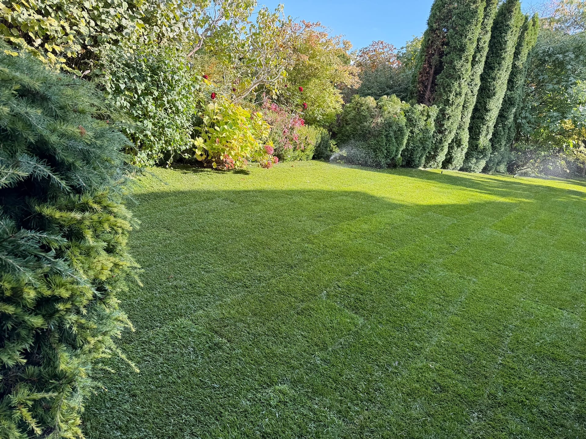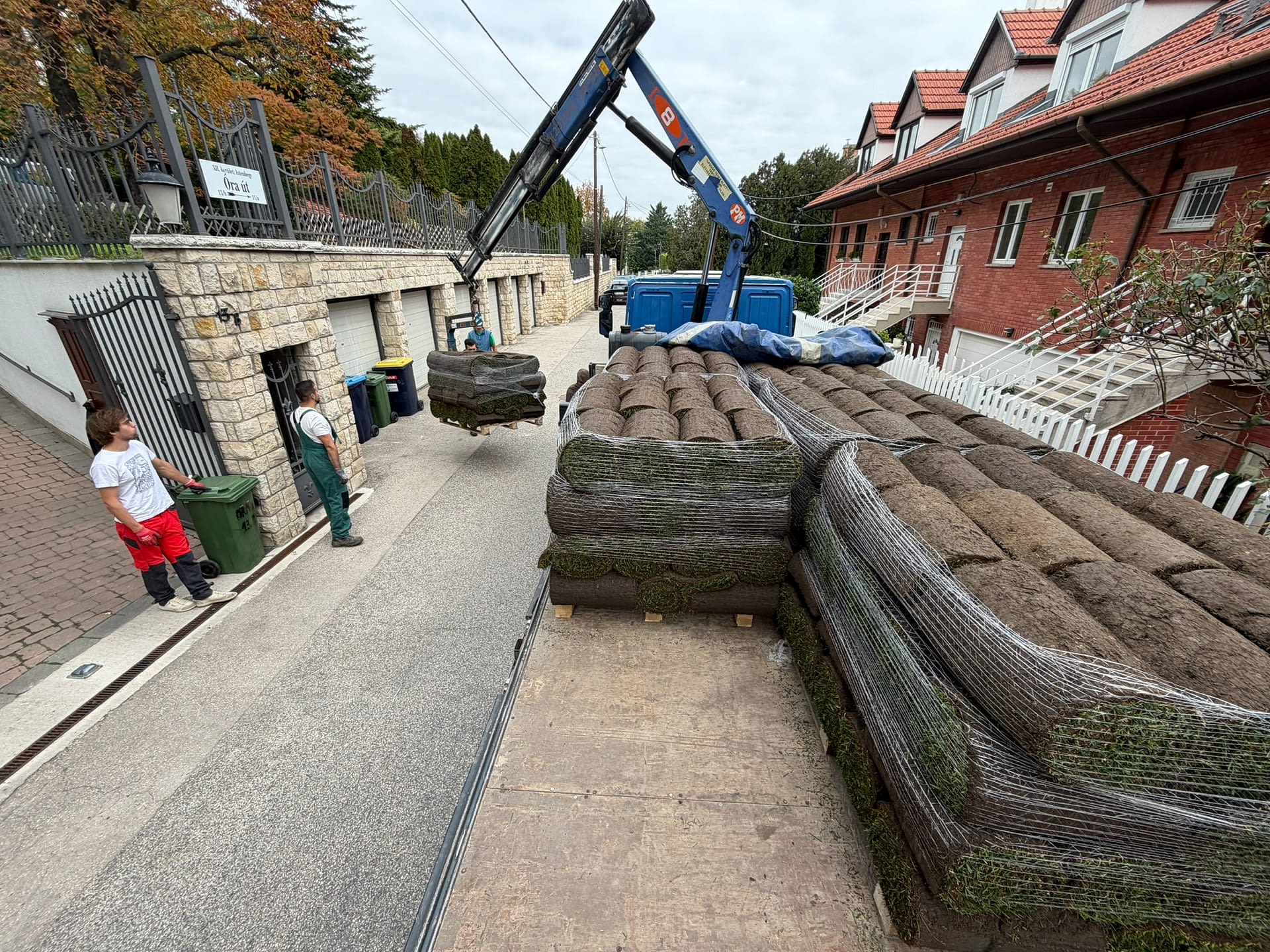 A gyepszőnyeget starter műtrágyával támogattuk, hogy minél gyorsabban megerősödjön és gyökeret eresszen. A telepítés végén alaposan beöntöztük a frissen lefektetett gyepet, hogy biztosítsuk a megfelelő indulást.
