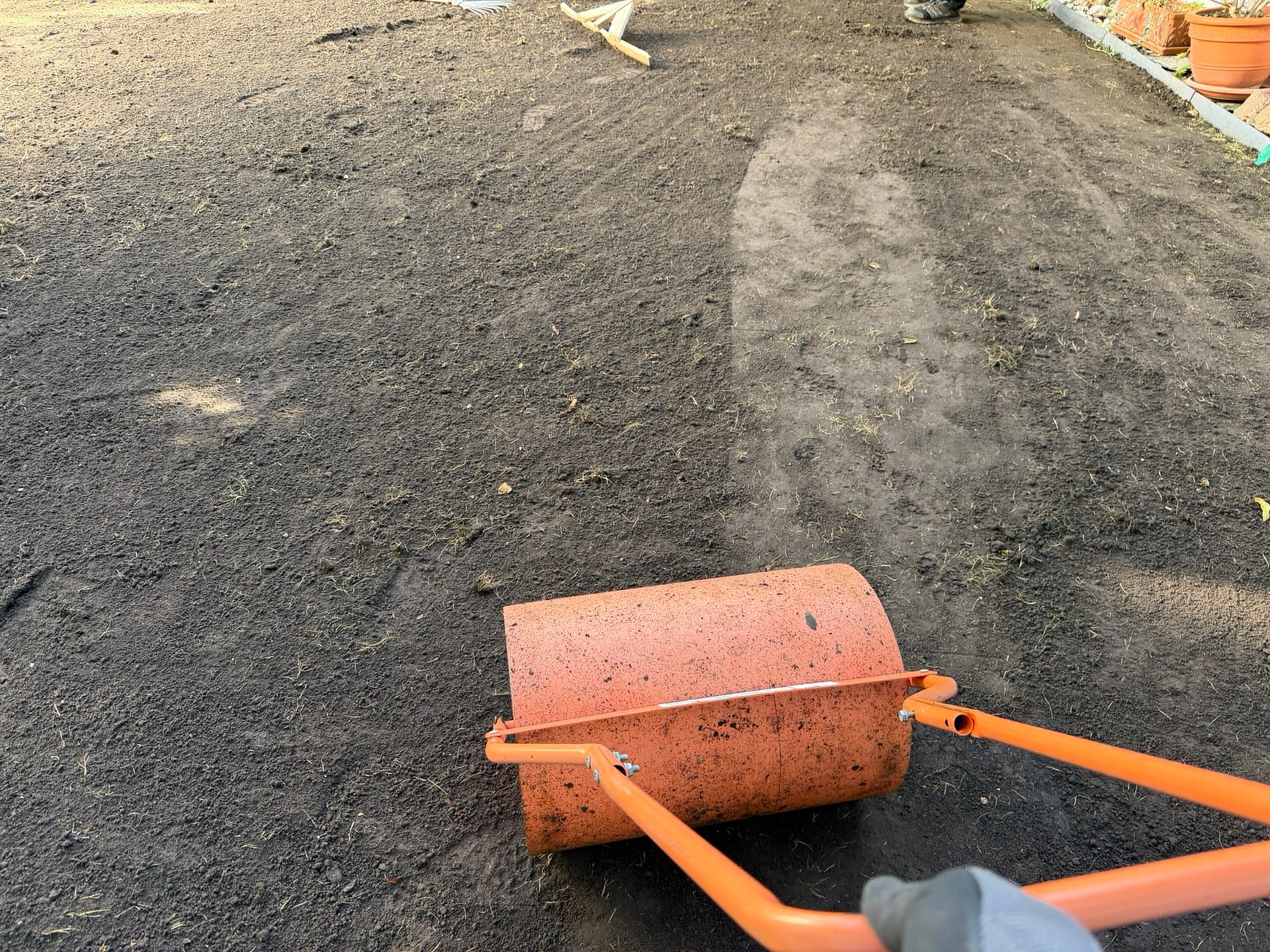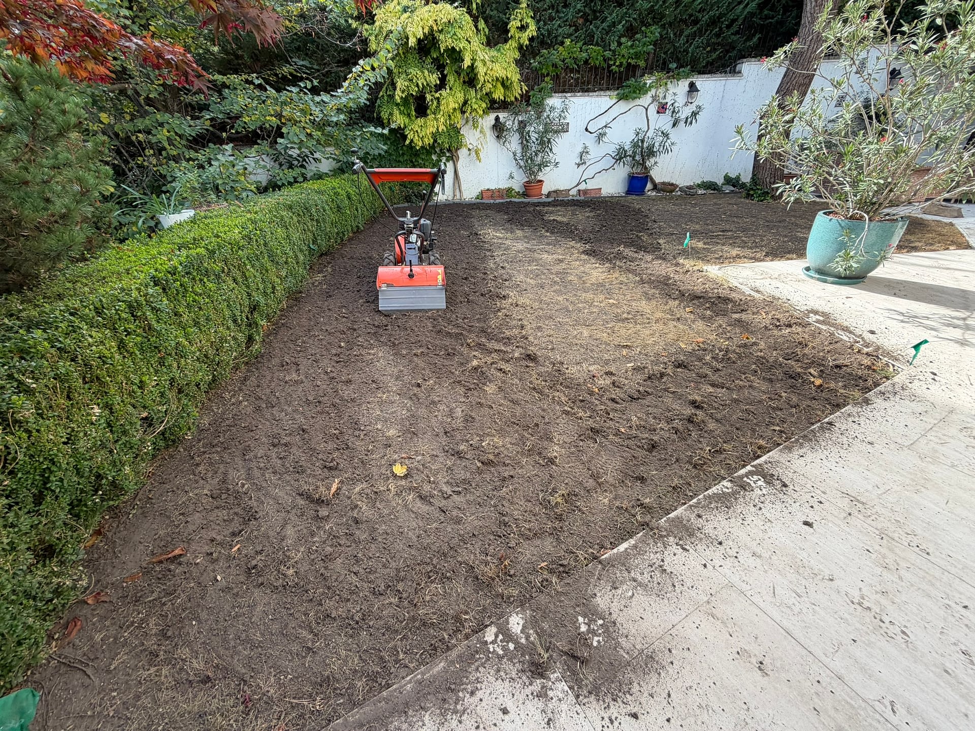 Miután a teljes területet gyommentesítettük, megkezdtük a talaj újjáélesztését. Felrotáltuk, majd eltávolítottuk az elhalt, elöregedett gyepet, hogy tiszta alapokkal dolgozhassunk. A következő lépésben szinteztük a területet, eltüntetve az évek alatt kialakult talajegyenetlenségeket. A gondos szintezés és hengerezés után egy tökéletesen sík, rendezett fogadófelületet kaptunk – készen arra, hogy új élet költözzön bele.